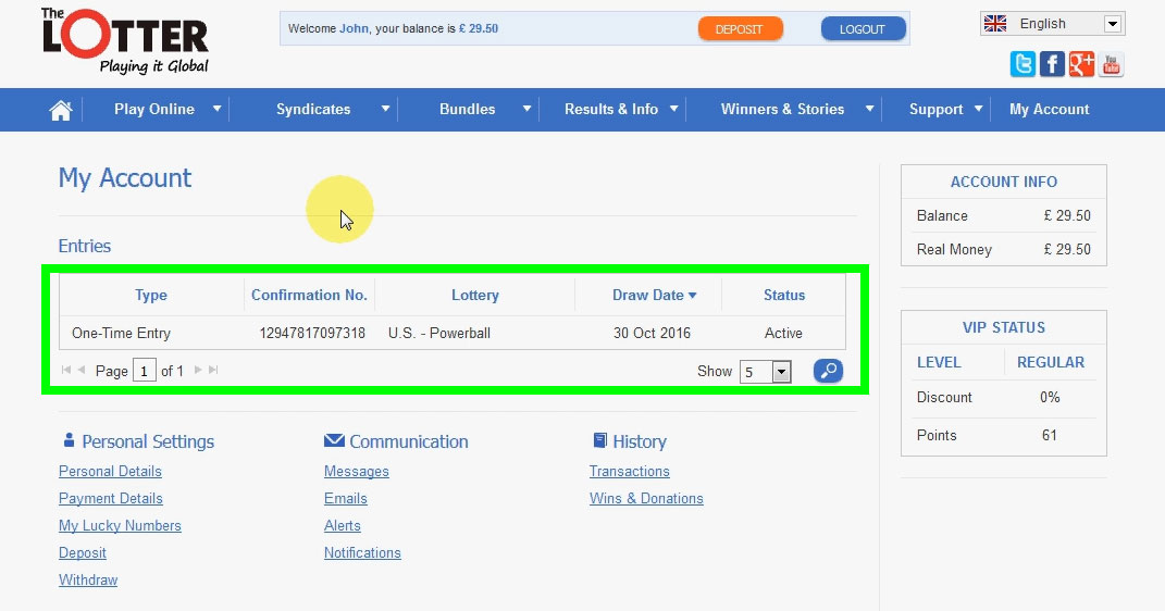 • Go to your lottery account dashboard and in your account you will find your lottery ticket entry which is marked in a GREEN box on the image to the left.